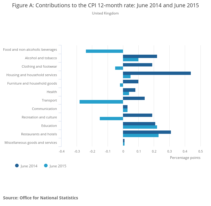 Figure A shows the contributions to the CPI 12-month rate in June 2015 compared with the contributions to the 12-month rate a year earlier. A larger version of the chart can be viewed by clicking on it (HTML version only).