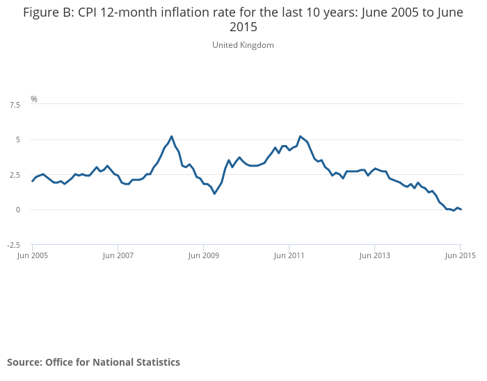 The CPI 12-month rate (the amount prices change over a year) between June 2014 and June 2015 stood at 0.0%. This means that a basket of goods and services that cost £100.00 in June 2014 would still have cost £100.00 in June 2015. This continues the trend of the previous 4 months when inflation had been at or around 0.0%.