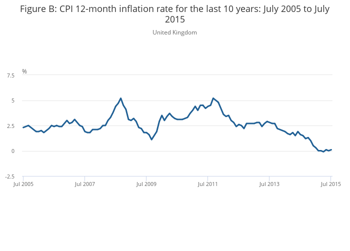 Download this chart Figure B: CPI 12-month inflation rate for the last 10 years: July 2005 to July 2015