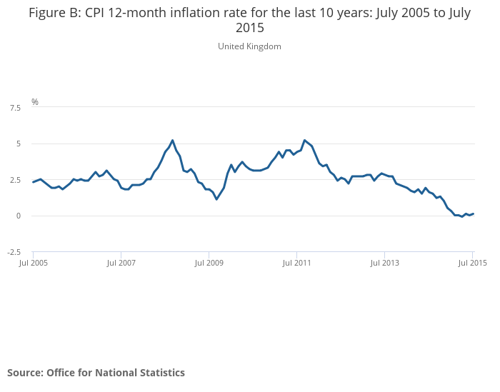 The CPI 12-month rate (the amount prices change over a year) between July 2014 and July 2015 stood at 0.1%. This means that a basket of goods and services that cost £100.00 in July 2014 would have cost £100.10 in July 2015. This continues the trend of the previous 5 months when inflation had been at or around 0.0%.