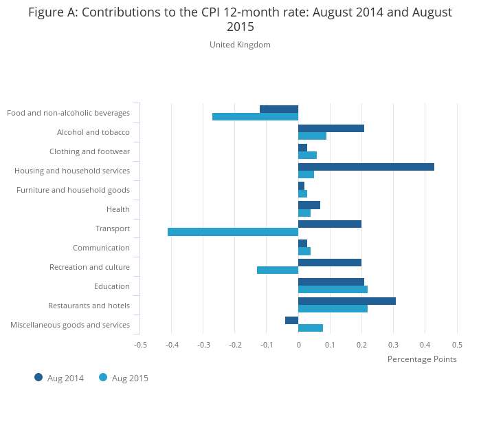 Figure A shows the contributions to the CPI 12-month rate in August 2015 compared with the contributions to the 12-month rate a year earlier. A larger version of the chart can be viewed by clicking on it (HTML version only).