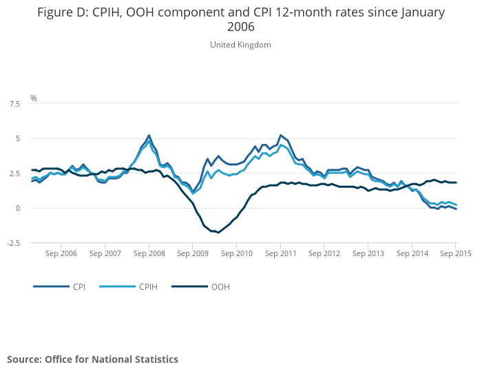 In September 2015, the 12-month rate (the rate at which prices increased between September 2014 and September 2015) for CPIH stood at 0.2%, down from 0.3% in August 2015. The difference between the CPI and CPIH annual rates in September 2015 was 0.3 percentage points, the same as the difference in August. Owner occupiers’ housing costs increased by 0.1% between August and September 2015, the same as between these months a year earlier. This meant it had a negligible impact on the change in the CPIH 12-month rate between the 2 months.