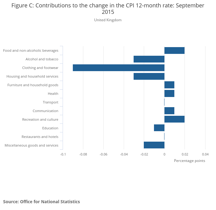 The CPI 12-month rate (the amount prices change over a year) between September 2014 and September 2015 stood at a negative 0.1%. This means that a basket of goods and services that cost £100.00 in September 2014 would have cost £99.90 in September 2015. This continues the trend of most of 2015 when inflation had been at or around 0.0%.