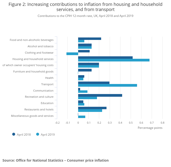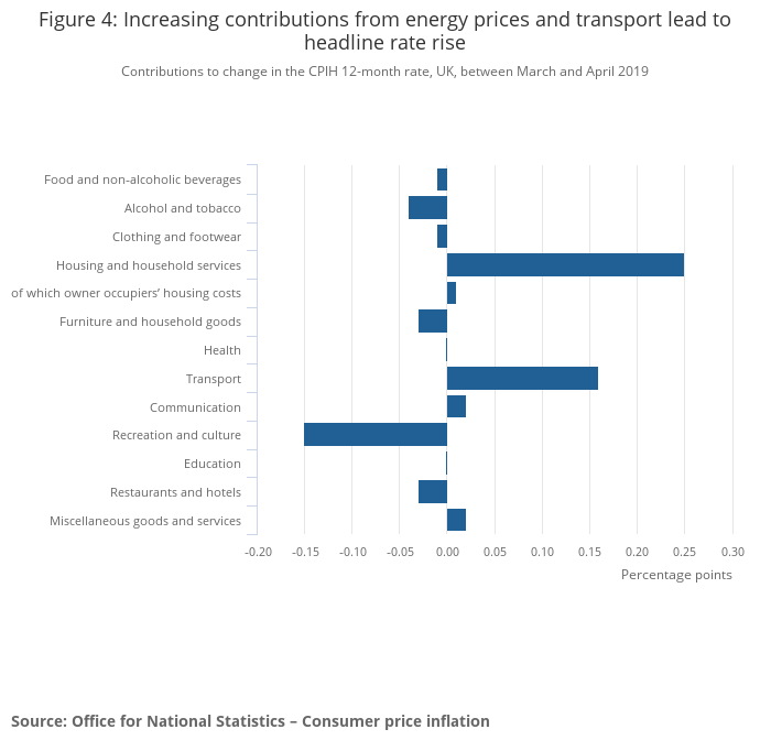 In January 2019, falling gas and electricity prices reduced the contribution from housing and household services, and the overall CPIH 12-month rate. However, energy prices rose in April 2019 increasing inflation above 2% for the first time in 2019.