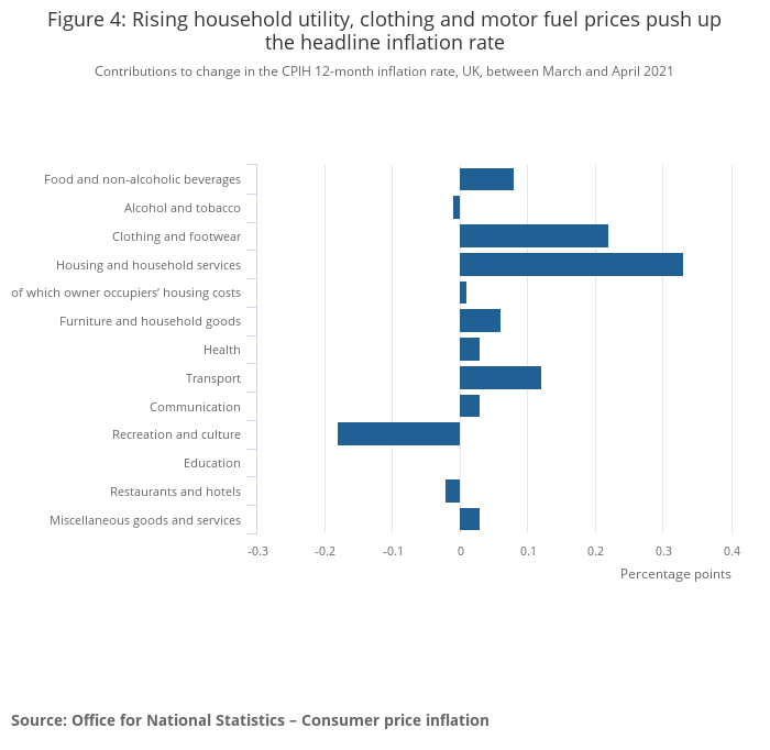 Image .csv .xlsFigure 4 shows how each of the main groups of goods and services contributed to the change in the Consumer Prices Index including owner occupiers’ housing costs (CPIH) 12-month inflation rate between March and April 2021. The corresponding figures for the Consumer Prices Index (CPI) can be found in Column F of Table 26 in the Consumer price inflation dataset.