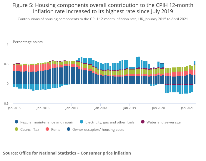 Image .csv .xlsFigure 5 shows the contribution of owner occupiers’ housing costs (OOH) and Council Tax to the Consumer Prices Index including owner occupiers’ housing costs (CPIH) 12-month inflation rate in the context of wider housing-related costs. In April 2021, the contribution of housing components to the CPIH 12-month inflation rate was 0.57 percentage points, its highest contribution since July 2019.