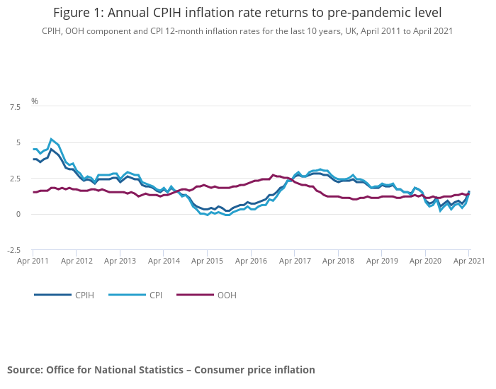 The Consumer Prices Index including owner occupiers’ housing costs (CPIH) rose by 1.6% in the 12 months to April 2021, up from 1.0% growth to March.