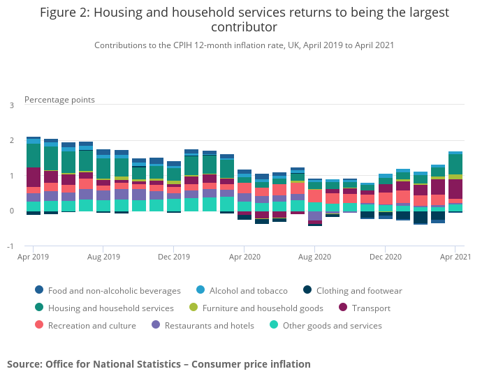 Between March and April 2021, there were several large, division-level increases to the contribution to the CPIH 12-month rate, with the largest overall contribution coming from housing and household services.