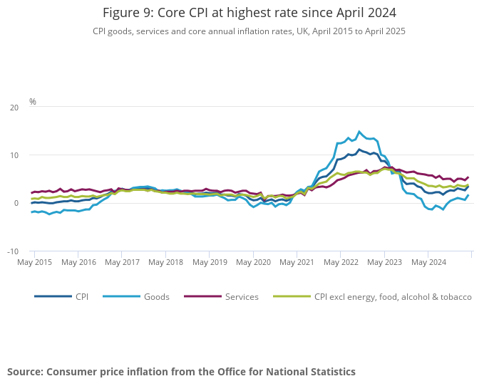 Core CPI (CPI excluding energy, food, alcohol and tobacco) rose by 3.8% in the 12 months to April 2025, up from 3.4% in the 12 months to March; the CPI goods annual rate rose from 0.6% to 1.7%, while the CPI services annual rate rose from 4.7% to 5.4%.