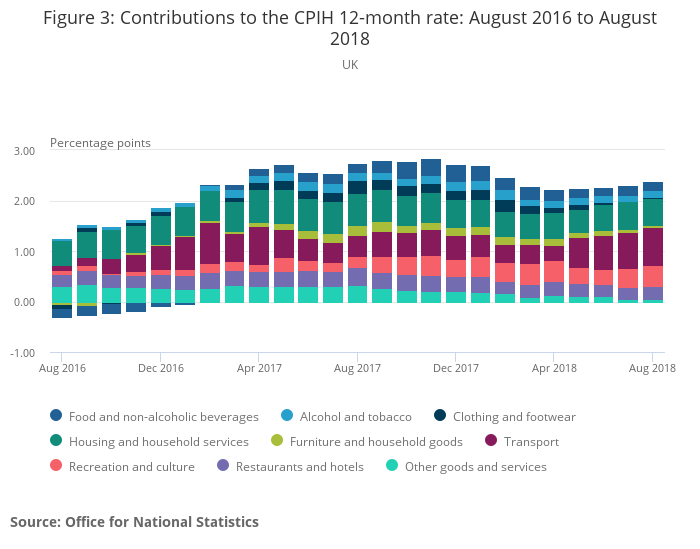 The Consumer Prices Index including owner occupiers’ housing costs (CPIH) 12-month inflation rate was 2.4% in August 2018, up from 2.3% in July 2018.