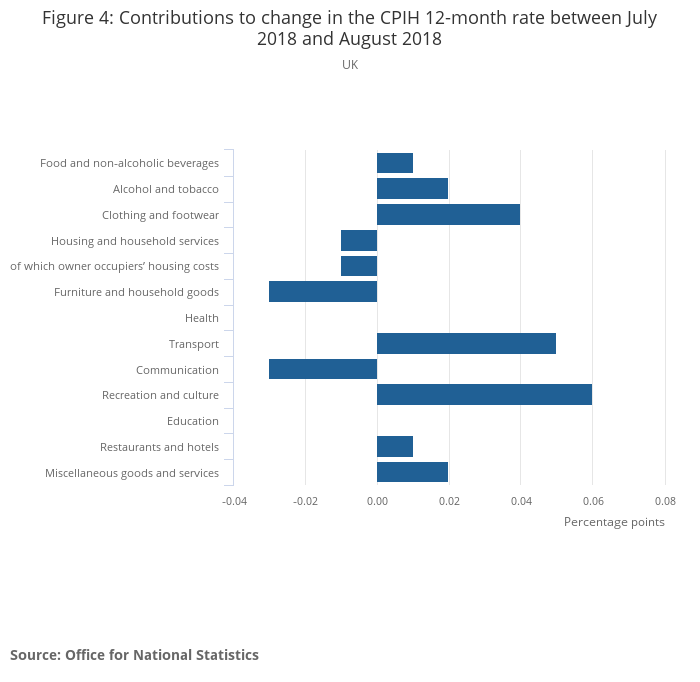 Figure 4 shows how each of the main groups of goods and services contributed to the change in the Consumer Prices Index including owner occupiers’ housing costs (CPIH) 12-month rate between July and August 2018. The corresponding figures for the Consumer Prices Index (CPI) can be found in column F of Table 26 in the Consumer price inflation dataset.