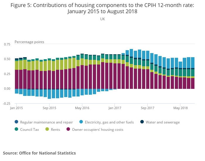 Utility bills made a negative contribution during 2015 and 2016 but more recent rises, most notably in electricity prices, have seen its contribution turn positive through 2017 into 2018. Increases in Council Tax starting in 2016 mean that its contribution has also increased over this period.