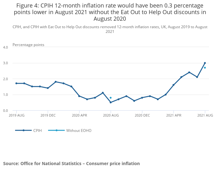 Image .csv .xlsThe Consumer Prices Index including owner occupiers' housing costs (CPIH) rose by 3.0% in the 12 months to August 2021, up from 2.1% to July. This is the largest ever recorded change in the CPIH 12-month inflation rate1. Previously the largest change was recorded in December 2008, when the 12-month rate decreased 0.8 percentage points to 3.0%. Inflation rates at this time are influenced by the effects of the coronavirus (COVID-19) lockdowns in 2020. The Office for National Statistics' (ONS) blog Beware Base Effects describes how relatively low prices for some items during and after that period influence current inflation rates. In particular, in August 2020 many prices in restaurants and cafes were discounted because of the government's Eat Out to Help Out (EOHO) scheme, which offered customers half-price food and drink to eat or drink in (up to the value of £10) between Mondays and Wednesdays. Because EOHO was a short-term scheme, the upward shift in the August 2021 12-month inflation rate is likely to be temporary.