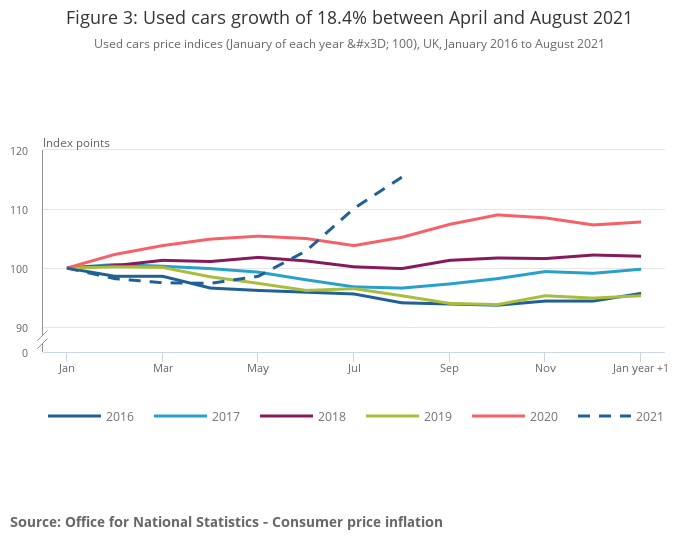 Used cars price indices (January of each year = 100), UK, January 2016 to August 2021