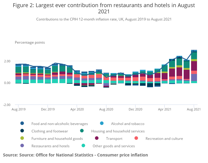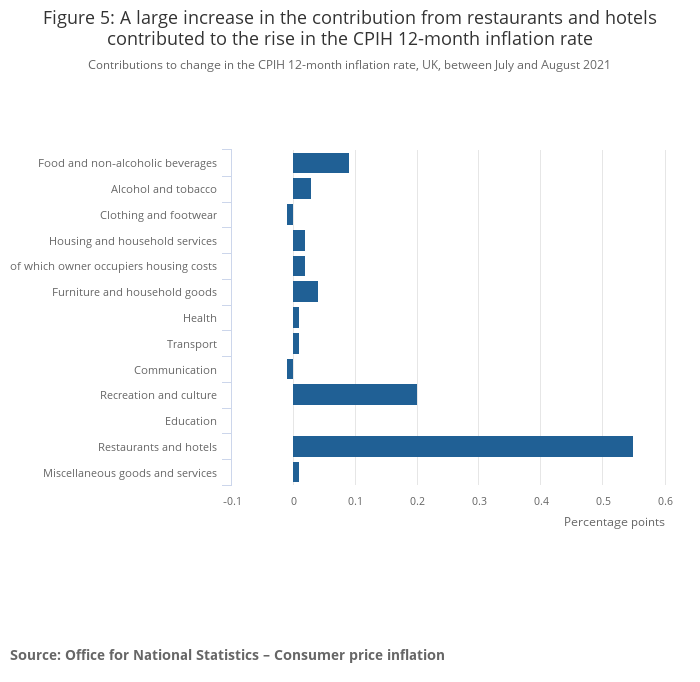 - The largest upward contribution to the August 2021 CPIH 12-month inflation rate came from transport (0.87 percentage points) with further large upward contributions from restaurants and hotels (0.65 percentage points), housing and household services (0.65 percentage points), and recreation and culture (0.28 percentage points).