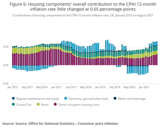 Image .csv .xlsFigure 5 shows the contribution of owner occupiers' housing costs (OOH) and Council Tax to the Consumer Prices Index including owner occupiers' housing costs (CPIH) 12-month inflation rate in the context of wider housing-related costs. In August 2021, the contribution of housing components to the CPIH 12-month inflation rate was 0.65 percentage points, little changed from July 2021.