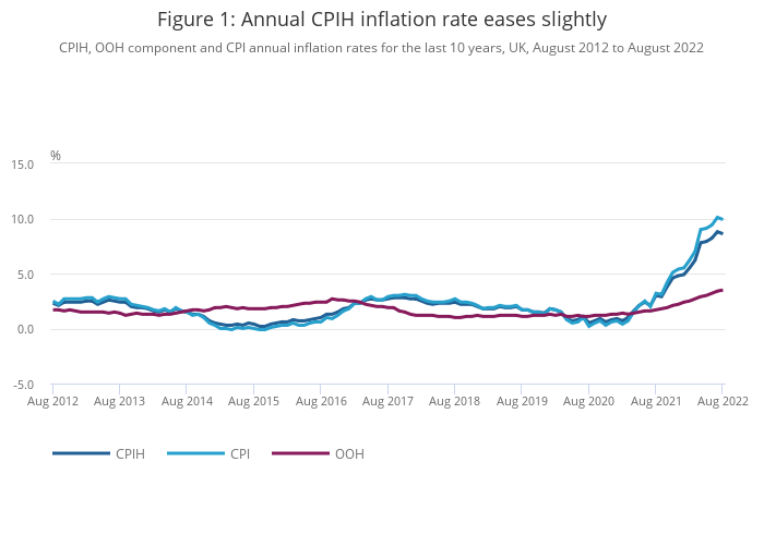 - The Consumer Prices Index including owner occupiers’ housing costs (CPIH) rose by 8.6% in the 12 months to August 2022, down from 8.8% in July.