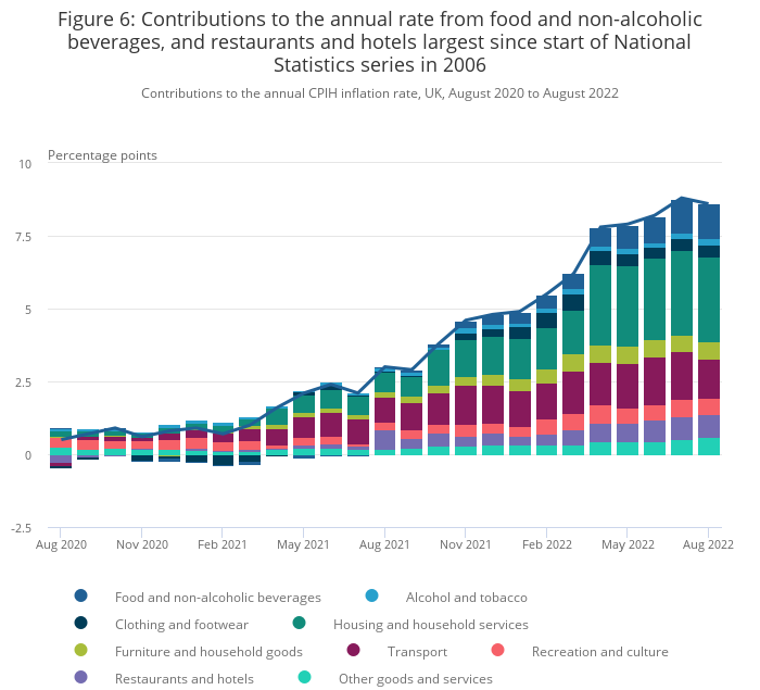 - The largest upward contributions to the annual CPIH inflation rate in August 2022 came from housing and household services (principally from electricity, gas and other fuels, and owner occupiers’ housing costs), transport (principally motor fuels), and food and non-alcoholic beverages.