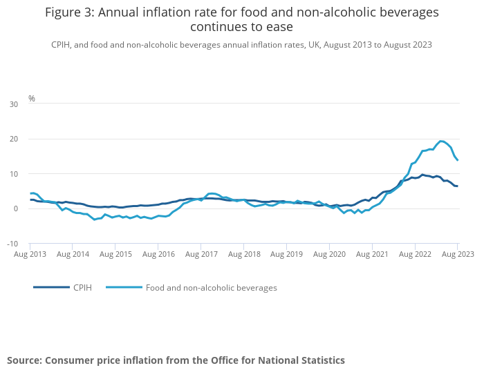 CPIH, and food and non-alcoholic beverages annual inflation rates, UK, August 2013 to August 2023