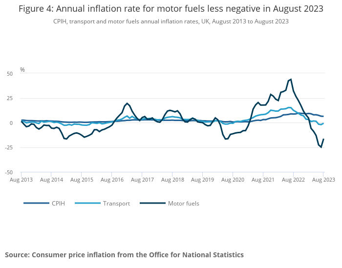 CPIH, transport and motor fuels annual inflation rates, UK, August 2013 to August 2023