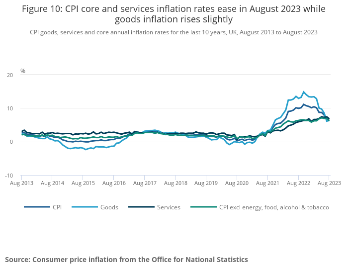 CPI goods, services and core annual inflation rates for the last 10 years, UK, August 2013 to August 2023