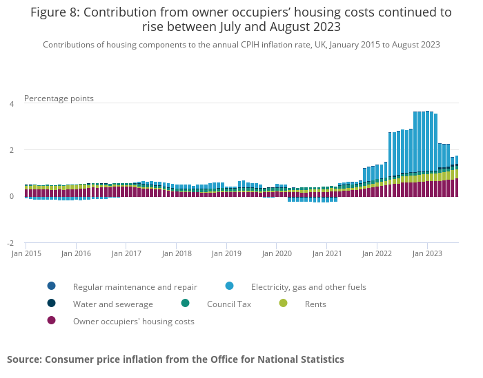 OOH's contribution rose from 0.74 to 0.78 percentage points between July and August 2023, continuing the increase seen over the past three years. The contribution from Council Tax was little changed at 0.14 percentage points between July and August 2023, while the contribution from housing and household services in total rose from 1.71 to 1.77 percentage points.