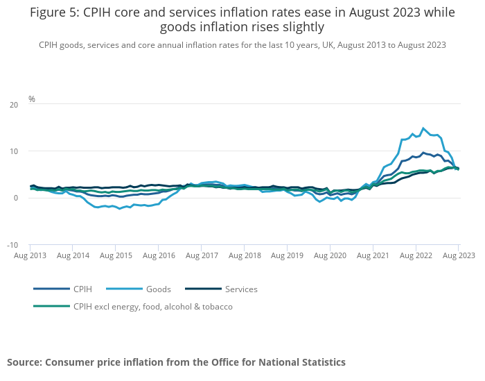 Core CPIH (excluding energy, food, alcohol and tobacco) rose by 5.9% in the 12 months to August 2023, down from 6.4% in July; the CPIH goods annual rate rose slightly from 6.1% to 6.3%, while the CPIH services annual rate slowed from 6.5% to 6.1%.