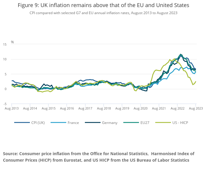 Figure 9 shows CPI inflation against the EU and Group of Seven (G7) countries that produce a comparable measure. Further information on international comparisons can be found in our Food and energy price inflation, UK: 2023 article, released on 23 May 2023.