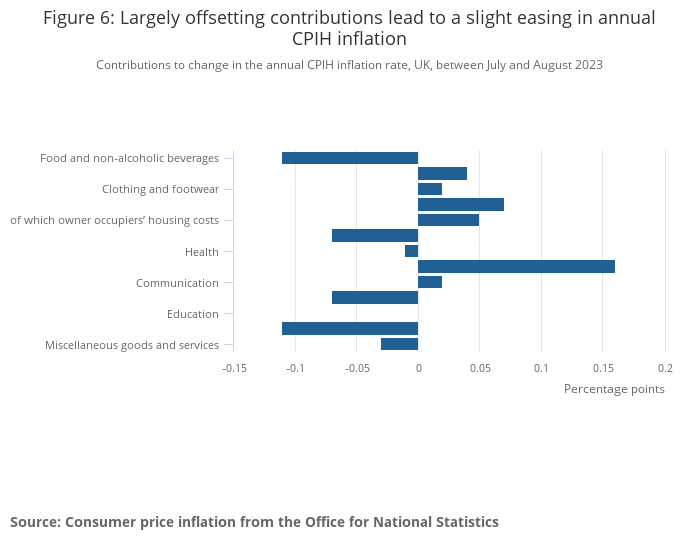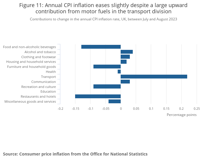 Contributions to change in the annual CPI inflation rate, UK, between July and August 2023