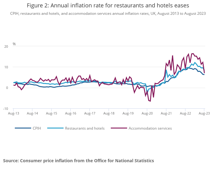 The annual inflation rate for restaurants and hotels was 8.3% in August 2023, down from 9.6% in July, and the lowest rate since May 2022. On a monthly basis, prices fell by 0.1% between July and August 2023, compared with a rise of 1.0% between the same two months a year ago.