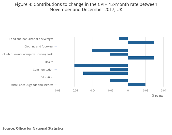 Figure 4 shows how each of the main groups of goods and services contributed to change in the Consumer Prices Index including owner occupiers’ housing costs (CPIH) 12-month rate between November and December 2017. The corresponding figures for the Consumer Prices Index (CPI) can be found in column F of Table 26 in the Consumer price inflation dataset.
