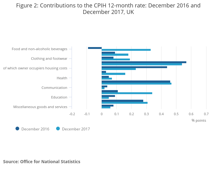 Figure 2 shows that price movements for all the broad categories of goods and services had an upward effect on the Consumer Prices Index including owner occupiers’ housing costs (CPIH) 12-month rate in December 2017, as has been the case since March 2017.