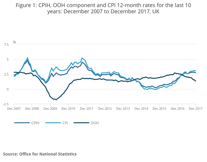 The Consumer Prices Index including owner occupiers’ housing costs (CPIH) 12-month inflation rate was 2.7% in December 2017, down from 2.8% in November 2017.