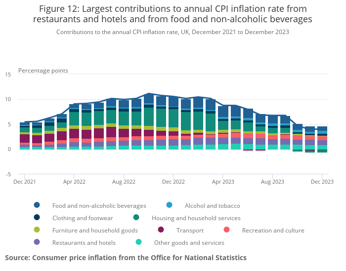 Contributions to the annual CPI inflation rate, UK, December 2021 to December 2023