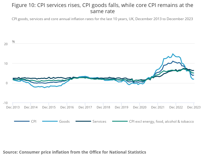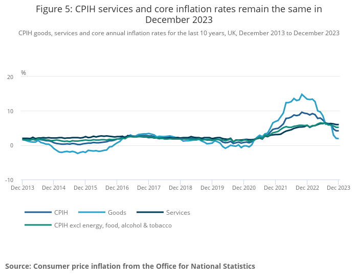 Annual core CPI rose by 5.1% in the year to December 2023, the same rate as in November and down from a recent high of 7.1% in May, which was the highest recorded since March 1992. The CPI all goods index rose by 1.9 in the year to December 2023, down from 2.0% in November. The CPI all services index rose by 6.4% in the year to December 2023, up from 6.3% in November 2023 and down from 7.4% in July 2023, which was the joint-highest rate (with May 2023) since March 1992.