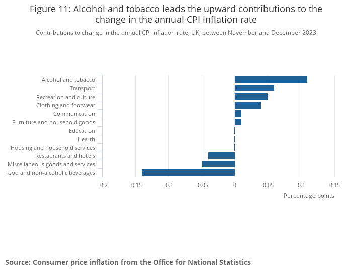 Alcohol made a smaller contribution to the rise in the annual rate. Alcohol prices fell by 1.6% between November and December 2023 and by 2.3% between the same two months last year, leading to an annual increase of 9.6%.