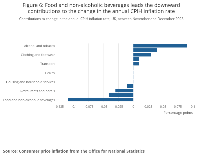The identical CPIH annual inflation rates in November and December reflected downward contributions from three divisions (most notably food and non-alcoholic beverages) and upward contributions from five divisions (most notably alcohol and tobacco).