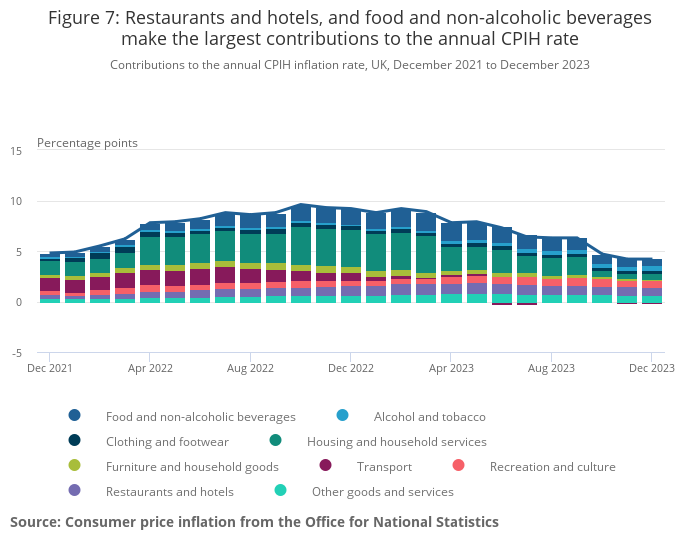 The CPIH includes extra housing components not included in the CPI. This can result in the largest contributions to the annual CPI and CPIH inflation rates coming from different divisions. However, in December 2023, the largest-contributing divisions were the same, namely restaurants and hotels (with a contribution of 0.97 percentage points to the CPI annual rate) and food and non-alcoholic beverages (with a contribution of 0.94 percentage points).