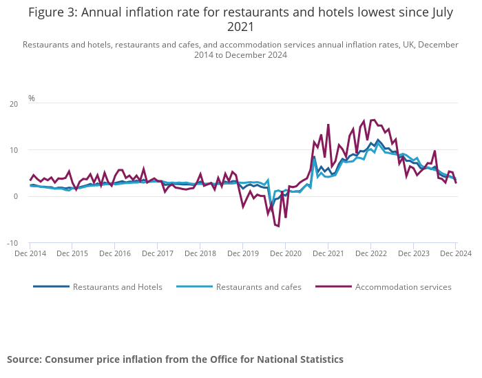 The annual inflation rate for restaurants and hotels was 3.4% in December 2024. This is down from 4.0% in November and is the lowest annual rate since July 2021. On a monthly basis, prices fell by 0.1%, compared with a rise of 0.5% a year ago.
