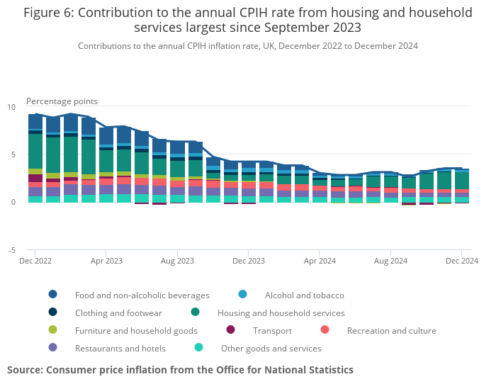 The annual inflation rate for housing and household services was 6.0% in December 2024, up from 5.8% in November. This compares with a recent peak of 11.8% observed in January and February 2023. On a monthly basis, prices rose by 0.4% in December 2024, compared with a rise of 0.3% a year ago.