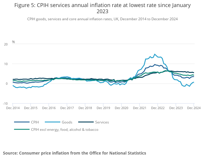 Core CPIH (excluding energy, food, alcohol, and tobacco) rose by 4.2% in the 12 months to December 2024, down from 4.4% in November; the CPIH goods annual rate rose from 0.4% to 0.7%, while the CPIH services annual rate fell from 5.7% to 5.4%.