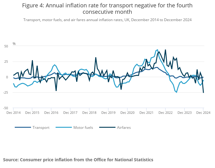 Transport, motor fuels, and air fares annual inflation rates, UK, December 2014 to December 2024