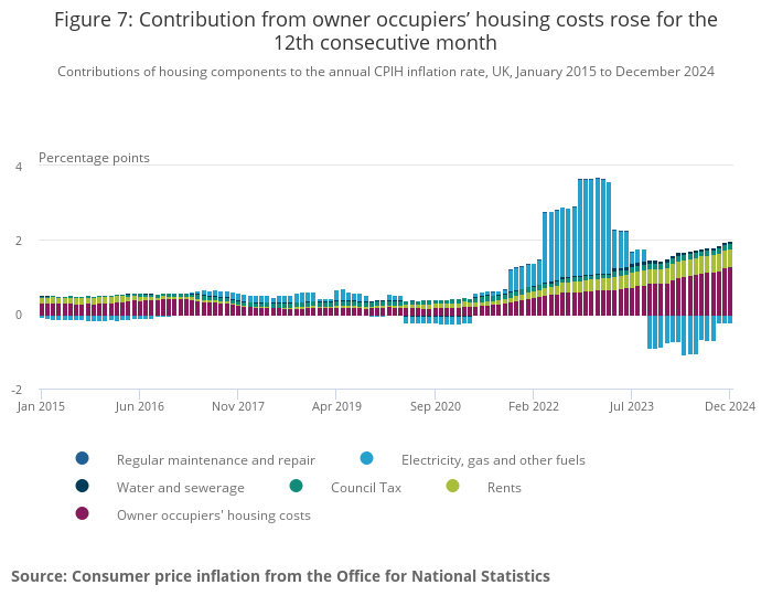 The owner occupiers’ housing costs (OOH) component of CPIH rose by 8.0% in the 12 months to December 2024, up from 7.8% in the 12 months to November. This is the highest annual rate since February 1992 in the constructed historical series. OOH costs rose by 0.6% on the month, compared with a 0.4% increase a year earlier.