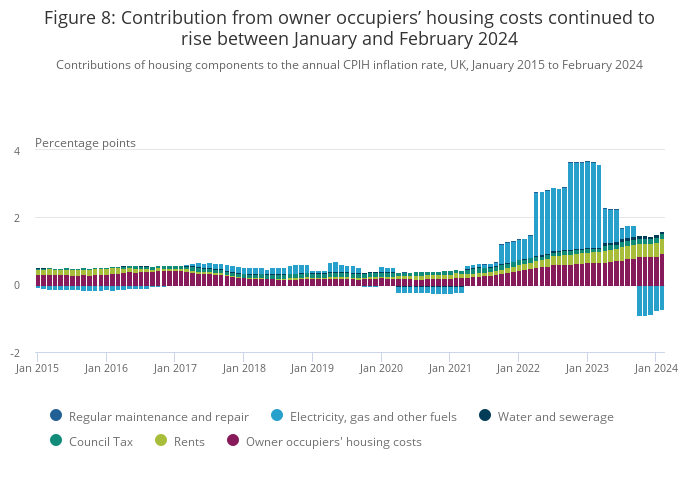 The Consumer Prices Index including owner occupiers' housing costs (CPIH) rose by 3.8% in the 12 months to February 2024, down from 4.2% in January.