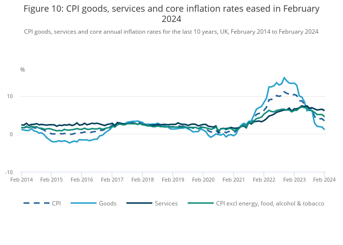 CPI goods, services and core annual inflation rates for the last 10 years, UK, February 2014 to February 2024