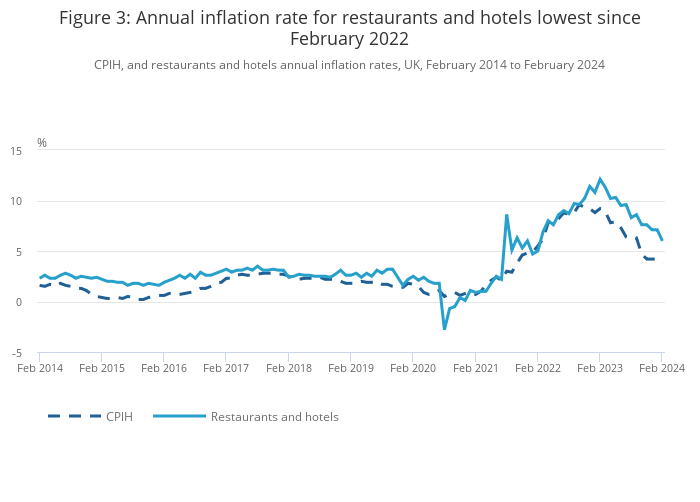 The annual inflation rate for restaurants and hotels was 6.0% in February 2024, down from 7.1% in January, and the lowest rate since February 2022. On a monthly basis, prices rose by 1.0% between January and February 2024, compared with a rise of 2.0% between the same two months a year ago.