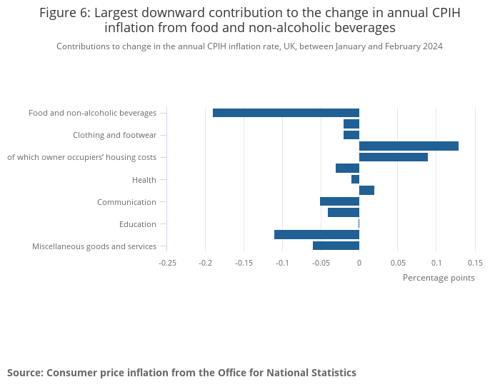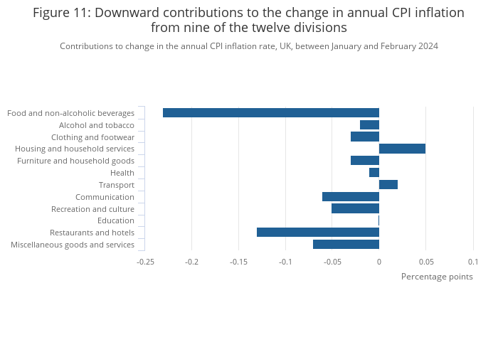 Contributions to change in the annual CPI inflation rate, UK, between January and February 2024