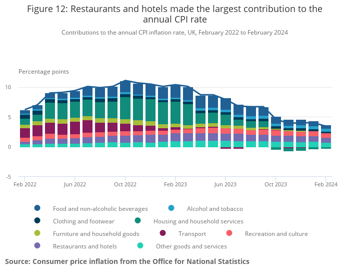 Contributions to the annual CPI inflation rate, UK, February 2022 to February 2024