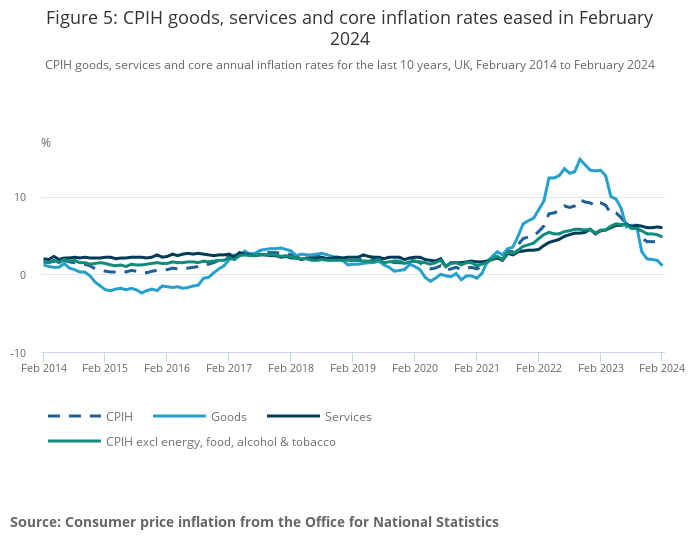 Core CPIH (excluding energy, food, alcohol and tobacco) rose by 4.8% in the 12 months to February 2024, down from 5.1% in January; the CPIH goods annual rate slowed from 1.8% to 1.1%, while the CPIH services annual rate eased slightly from 6.1% to 6.0%.
