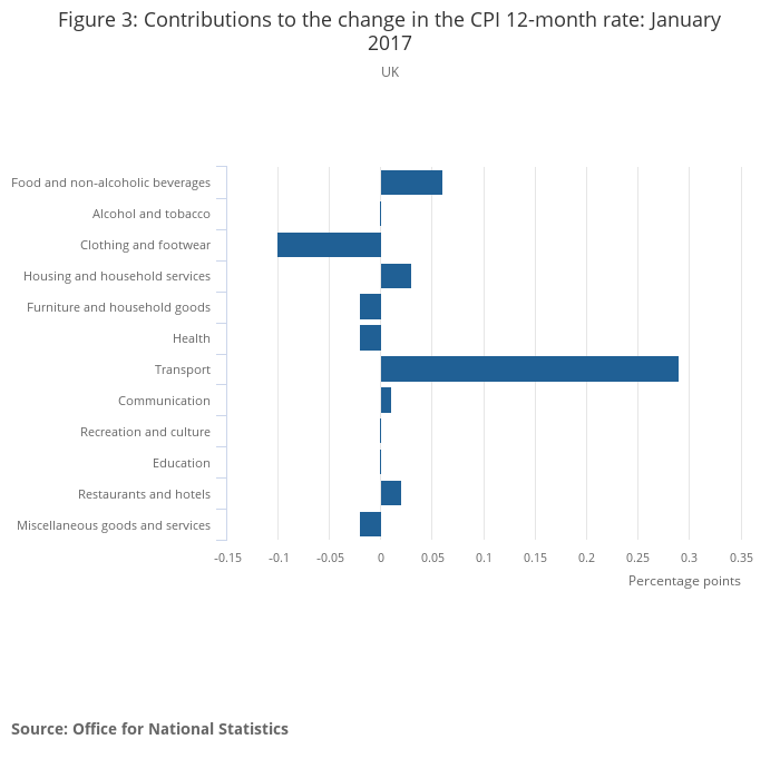 - The main contributors to the increase in the rate were rising prices for motor fuels and to a lesser extent food prices, which were unchanged between December 2016 and January 2017, having fallen a year ago.